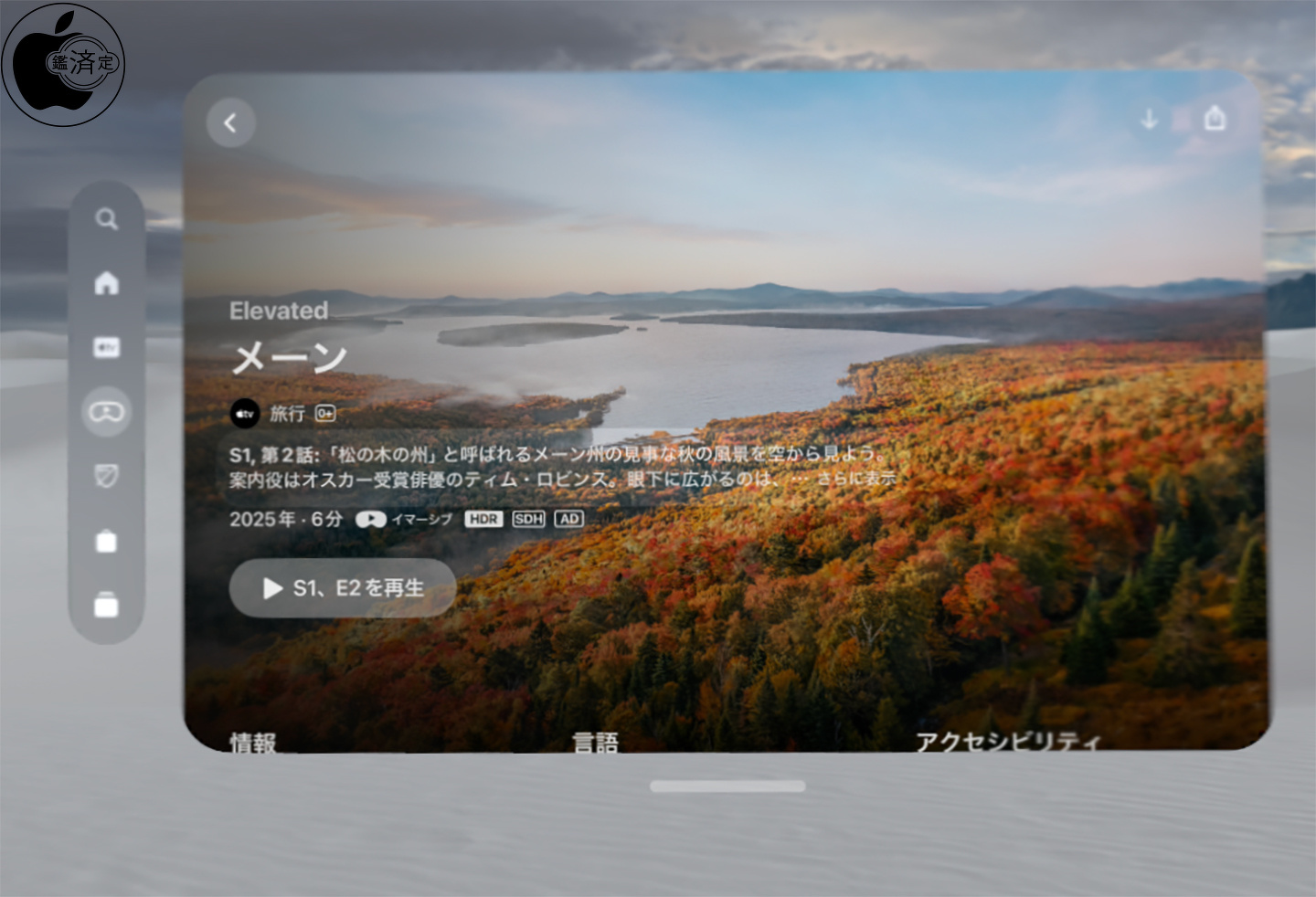 2025年10月04日(土) Vision#Apple#VisionPro#ImmersiveVideo Apple、新しいApple Immersive Videoとして空の旅シリーズ「Elevated」の「メーン」を配信開始 ※本サイトは、アフィリエイト広告および広告による収益を得て運営しています。購入により売上の一部が本サイトに還元されることがあります。 Elevated:メーン Appleが、Apple Vision Pro用の新しいApple Immersive Videoとして、空の旅シリーズ「Elevated」のシーズン1、エピソード2として、「松の木の州」と呼ばれるメーン州の見事な秋の風景を空から見る「メーン」の配信を開始しています。 案内役はオスカー受賞俳優のティム・ロビンスで、眼下に広がるのは、複雑な海岸線、澄んだ湖、オレンジや深紅や金色など秋の色彩であふれる森を楽しめます。