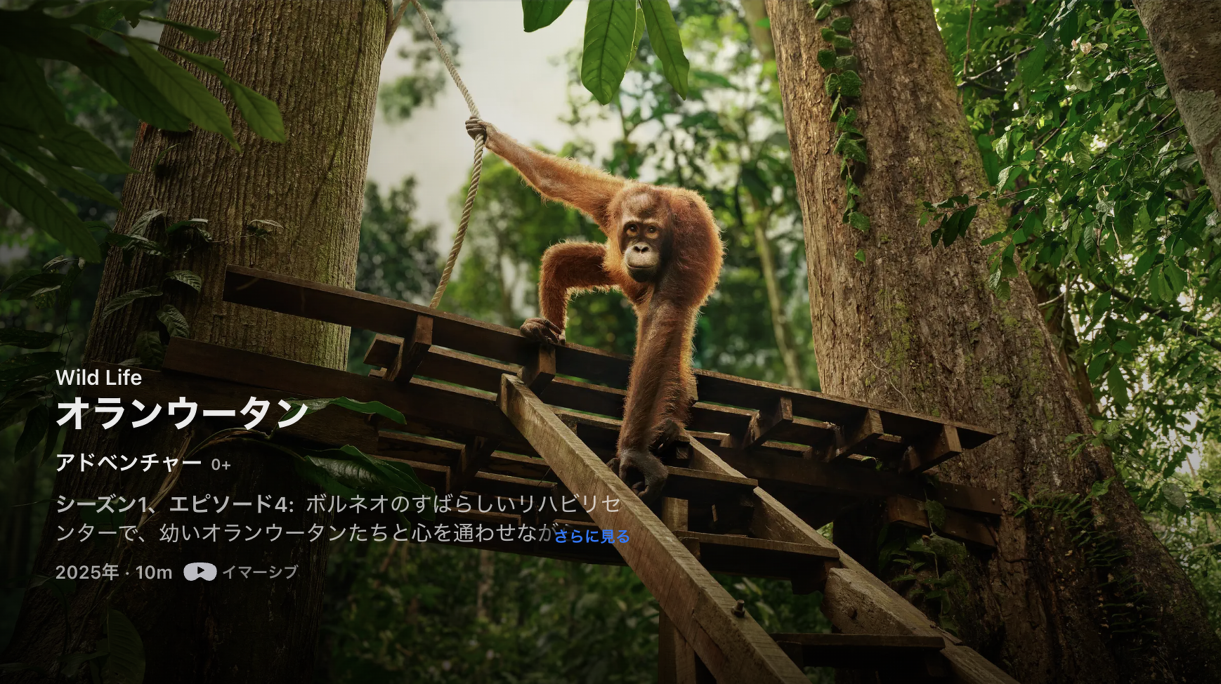 2025年08月08日(金) Vision#Apple#VisionPro#ImmersiveVideo Apple、Apple Immersive Video「Wild Life」の新しいエピソード「オランウータン」を配信開始 ※本サイトは、アフィリエイト広告および広告による収益を得て運営しています。購入により売上の一部が本サイトに還元されることがあります。 オランウータン Appleが、Apple Vision Pro用の新しいApple Immersive Videoとして、地球に棲むカリスマ性のある生物達を見るシリーズ「Wild Life」の第4弾コンテンツとして「オランウータン」の配信を開始しています。 ボルネオのすばらしいリハビリセンターで、幼いオランウータンたちと心を通わせながら、彼らが成長し、遊び、ジャングルで生きていく術を学ぶ様子を見守るう。 Vision : Apple、日本でもApple Immersive Video「Wild Life」の新しいエピソード「ゾウ」を配信開始 #Apple #VisionPro #ImmersiveVideo Vision : Apple、Apple Immersive Video「Wild Life」の新しいエピソード「サメ」を配信開始 #Apple #VisionPro #ImmersiveVideo