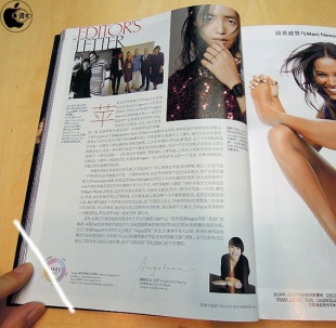 特集記事の前にEDITOR'S LETTER(62ページ)が掲載されていて、Vogue ChinaのAngelica Cheung編集長が、Appleのスペシャルイベントに招待され、Tim Cook CEO、Jonathan Ive氏と話し、コンセプトや情熱に感銘を受けたと記されています。