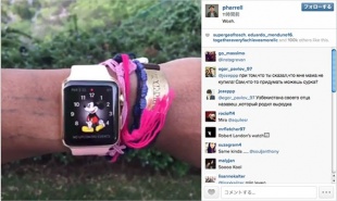 男性音楽プロデューサー、歌手、MC、ファッションデザイナーのPharrell Williams氏が、Apple Watch Edition(18Kローズゴールドケースとホワイトスポーツバンド)を腕につけ、ミッキーマウスの文字盤が表示される動画を、Instagramに投稿しています。