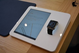 これは試着用のApple Watchでは動作しませんが、Apple Watchの画面と一緒にディスプレイ表示が動く展示台の場合、Watch OSの「ワークアウト」か「アクティビティ」を起動し、手を下にかざすと緑の光を確認することが出来ます。