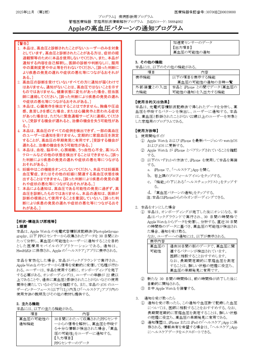 Appleは、2025年12月3日に家庭用脈波情報解析プログラムの1つ「高血圧パターンの通知プログラム」(IFU)として、ヴォーパル・テクノロジーズ株式会社を通じて「医療機器承認番号:30700BZI00039000」を取得しています。