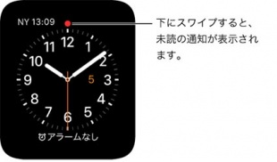 通知が届いたときにすぐに応答しなかった場合は、その通知は通知センターに保存され、文字盤上部に赤い点が表示されているときは、未読の通知があることを示しています。