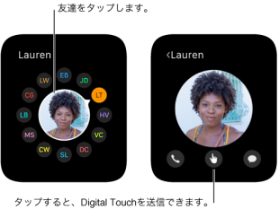 サイドボタンを押し、友達を選択してから、電話の発信、メッセージの送信、または Digital Touch の使用のいずれかを選択します。