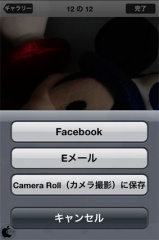 ギャラリー内に保存された写真や動画を表示して、アクションメニューをタップすると、カメラロールにコピーする他に、メール添付、Facebook投稿なども行うことが出来ます。