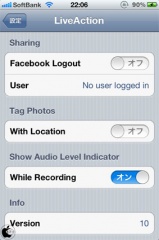 iOSの設定>LiveActionで、Facebook共有、位置情報、オーディオレベル表示のオン/オフを行う事が出来ます。