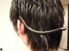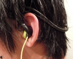 実際に装着してみると、通常のイヤホンと異なり、スピーカーユニットの丸い部分が横から耳に入る感じになります。