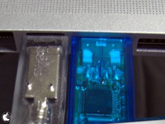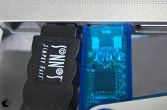 接続してる状態を拡大してみると、MacBook Pro (Late 2008)のFireWire 800ポートとUSB 2.0ポートが近すぎるため、FAD-824を抜き差しし易いデザインとして取り入れている部分が邪魔をして、隣のUSB 2.0ポートに接続したUSBメモリーと干渉してしまい、少し浮いているのがわかります。