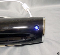 電源ボタンは右側上部にあり、電源を入れると青色LEDが連続フラッシュした後に点灯状態になります。