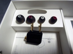付属品として、3サイズのシリコーンイヤーチップ、航空機用プラグアダプターが同梱されています。