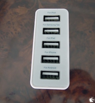 ポートは、上からiPad(2.1A)、サムスンタブレット(1.3A)、iPad(2.1A)、iPhone(1A)、Android(1A)となっています。