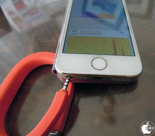 iPhone 5sのヘッドフォンジャックに、Up24のジャック部分を接続しようとしてみると、Upの場合と比べてジャック部分が細く、利用出来ないことが分かります。