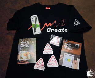 箱の中には、Jot Script本体に加えて、Adonit特製ステッカー、Adonit特製メモ帳、Adonit特製Tシャツ、パンフレットなどが入っていました。