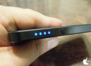 iPhone 5s/5のサウンドオン/オフ、音量調節ボタンがある位置に、電源ボタンと、バッテリー残量を示すランプが装備されています。