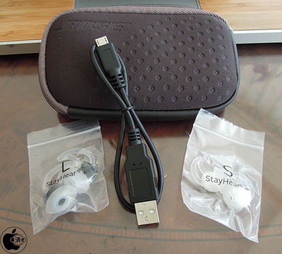 付属品は、キャリングポーチ、サイズチェンジ用StayHear+チップ、コントロールモジュールを充電するためのmicroUSBケーブル、マニュアルなどとなっています。