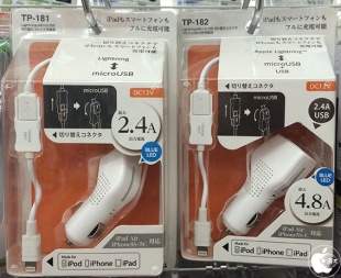 Lightningコネクタ切替式ケーブル搭載カーチャージャー「TP-181」と「TP-182」を販売開始しています。