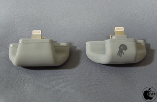 コの字型のLightning - Micro USBアダプタのLightningコネクタの根元形状が変更されていて、装着したケースのLightningコネクタポート用穴が狭い場合でも、装着出来るようになっています。