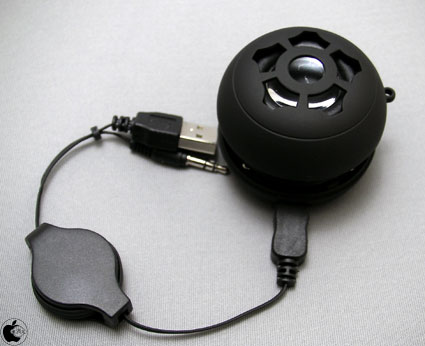 付属品として、USB充電ケーブルと3.5mmステレオミニジャック入力ピンが一体化された伸縮式ケーブルが付属しています。