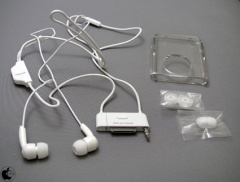 中に入っていたのは、耳の大きさに合わせた3サイズのイヤーパッドが付属した、Dockコネクタ接続のネックストラップ式のカナル型イヤフォン、クリスタルハードケースです。