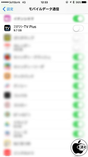 高画質設定の場合、あっという間にパケット転送料がGBを超えてしまうため、iOSの設定>モバイルデータ通信で、エリアフリーTV Plusの項目をオフにしておくことをお勧めします。