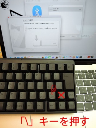 日本語配列モデル かな無刻印の場合、左のシフトキー横のキー認識の次に表示される「右 Shift キーの左隣のキー」を押すというガイドが表示されたとき、そのままだと「上矢印キー」を押すと認識されません。