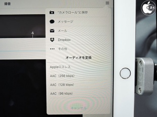 収録したオーディオファイルは、カメラロール保存、メッセージやメール添付などに加えて、Dropbox共有が行えます。