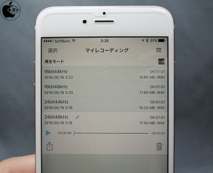 16bit/44.1kHzは10.68MB、16bit/48kHzは11.60MB、24bit/44.1kHzは16.03MB、24bit/48kHzは17.40MBでした。