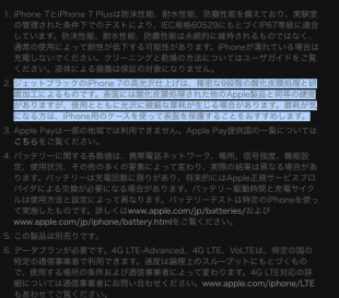 Appleの製品サイトには、ジェットブラックのiPhone 7の高光沢仕上げは、精密な9段階の酸化皮膜処理と研磨加工によるもので、表面には酸化皮膜処理された他のApple製品と同等の硬度がありますが、使用とともに光沢に微細な摩耗が生じる場合があります。