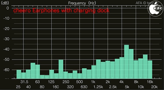 トオンのiPhone用オーディオ測定アプリ「Audio Frequency Analyzer」を使用し、YouTubeにある「20Hz to 20kHz (Human Audio Spectrum)」を再生し、1/3オクターブ・スケールで対数表示してみました。