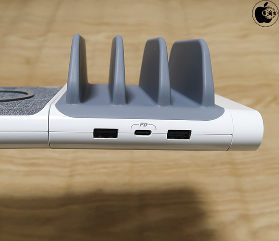 縦向きの充電スタンドは、USB PD/18W USB-Cポートが1つ、最大12W充電対応のUSB-Aポートが2つ装備されています。