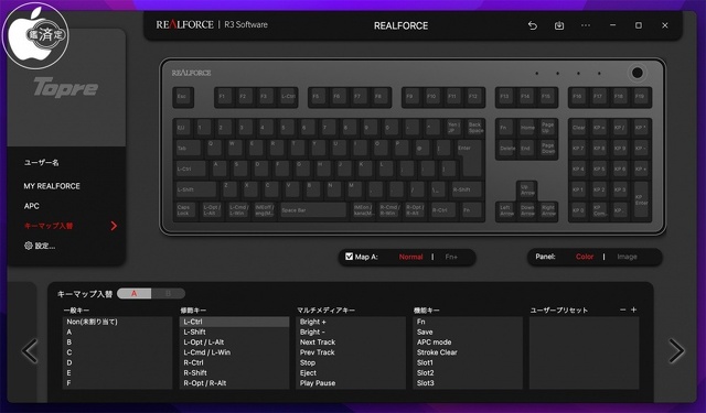 キーマップ入替も可能で、キーマップはA/Bの2面を持っており、設定したい面をクリックして選択します。