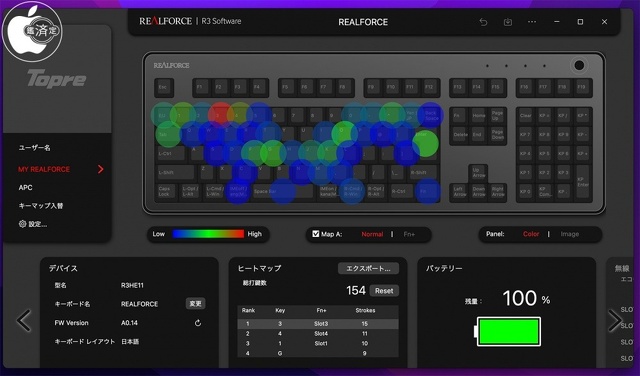 MacにREALFORCE R3 ソフトウェア for Macをインストールし、REALFORCE R3キーボード for MacをUSBケーブル接続すると、ヒートマップの確認を行うことが可能です。