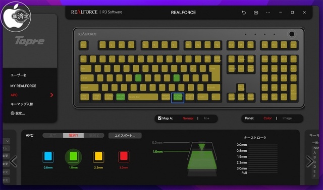 REALFORCE R3キーボード for MacはAPC 機能(アクチュエーションポイントチェンジャー)を搭載していて、REALFORCE R3 ソフトウェア for Macを使用することで、各キースイッチのオン位置を4段階 0.8mm、1.5mm、2.2mm、3.0mmに設定することが可能です。