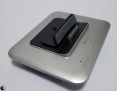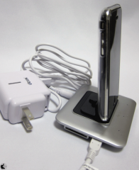 ドックステーション本体に、iPhone 3GSを装着してみると、背面ブラケットを後ろに引くことで、しっかりと装着することが出来ます。