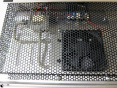 ボディ中央には、ヒートシンクにパイプが通ったラジエーターが装着されていて、その下にファンが配置されています。
