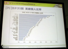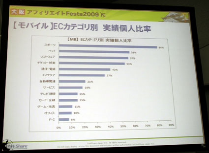次に、携帯電話におけるアフィリエイトを見てみると、企業のSEOがなかなか上手く行なえていない状況があり、個人でも検索結果で上位に表示される割合が高く、スポーツ(84%)、ペット(59%)、ソフトウェア(57%)、チケット・娯楽(54%)と、PCでの実績と比較して、個人割合が高いと説明した。