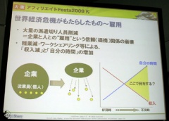 世界経済危機がもたらしたものとして、企業と人との「雇用」という信頼が揺らいでいるとし、残業減などによる「収入減」と「自分の時間」の増加が起きていると話した。