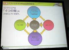 リンクシェアは、ECサイトとアフィリエイトのリレーションシップの強化、新サービス、蓄積されたデータ・ノウハウの提供、「場」の提供という4つの軸を中心に展開してゆくと話した。