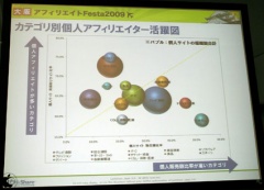 次に、カテゴリー別に、個人アフィリエイターの実績をバブルグラフを示した。これは、縦軸が実績を上げやすいカテゴリを示し、横軸が金額的な比率を示していると説明した。