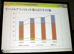 モバイルにおいては、同社と契約している約300社のECサイトのうち、PCサイトとモバイルサイトの両方のアフィリエイト提供を行っている企業が96社有り、年々増加傾向にあると説明した。