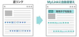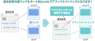 アフィリエイトリンクを設置しなかった過去記事に、直リンクを掲載している場合、サイトのヘッダー部分に「オートMyLink」専用のJSタグを貼るだけで、複数ページある過去記事の直リンクが、アフィリエイトリンクに自動変換されます。