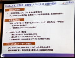 まとめとして、不況による、広告主・消費者・アフェリエイト全てが、質的変化をみせ、広告主は、成果報酬型重視の姿勢が強まり、消費者は回遊性が大きく高まり、アフェリエイトは、EC競合、アフェリエイト競合が激化したと説明していました。