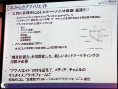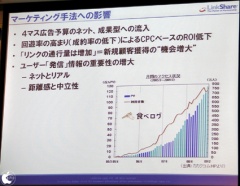 今後のリンクシェアの取組みとして、ECサイト側の要望が多様化していることから、購買影響力を指数化した、新しいネットマーケティングのための指標が必要だと考えていると述べていました。