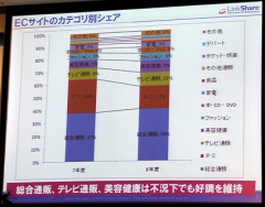 ECサイトのカテゴリ別シェアで比べると、PCの割合が26%から17%に減ったが、それ以外の分野割合が広がり、特に女性に強い分野のカテゴリが伸びていると言えると説明していました。