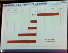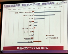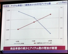 年度別のアイテム単価と1購買あたりの平均アイテム数で見てみると、商品単価が下がり、購入アイテム数が増加していることが見とれ、安い物をより多く購入する消費者の実態がこれでわかると説明していました。