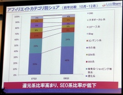アフェリエイトカテゴリ別シェアで見ると、ポイント還元系の成長率が高くなり、SEO、SEM系比率が低下していると見てとれ、検索エンジンの機能強化によって、陣取り系のシェアが下がっていると説明してました。