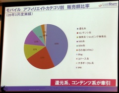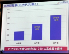 流通額推移からPCカテゴリを除くと、前年比124%の高成長を維持していることが分かり、経済不況の中で、アフェリエイトの成長率が高いことがわかると説明していました。