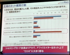 次に商品を購入した際、その商品を人にすすめることがありますか?というアンケートの結果を見てみると、ショッピングカード会員はリアルで、アフェリエイターはネット上でクチコミを拡げていることが読取れると分析していました。