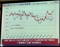 還元系カテゴリでの成約率推移を見てみると、本来決めうちのはずの還元系サイトでも成約率が低下傾向にあり、消費者の比較志向が強まっていることがわかると分析してました。