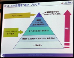 ネット上の消費者進化のプロセスとして、情報発信をしているアフィシューマー層は、いきなり始めるわけではなく、段階を踏んで進化してきた人達だと思うと説明していました。